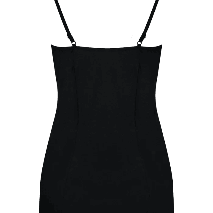 Vestido corto sexy suave y muy seductor de color negro liso con detalles de encaje, brillo y tanga a juego.