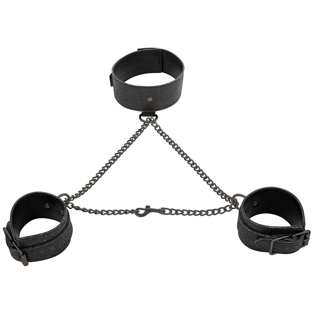 Una cadena negra mate se conecta a través de los anillos D en su puño y cuello que le permite ser creativo con la forma en que desea restringir.