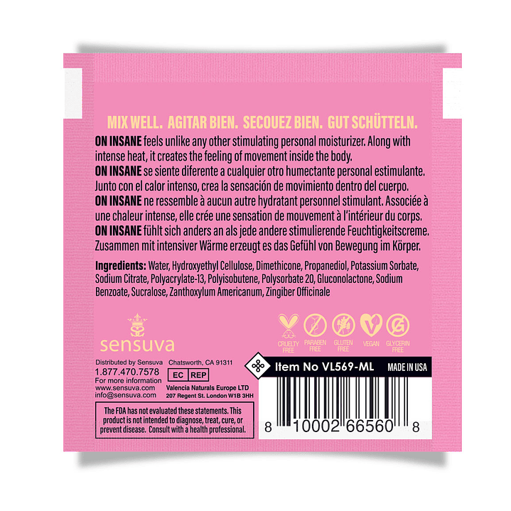 ON Insane es el humectante personal estimulante más intenso del mercado. Las mujeres experimentan la sensación de calor pulsante, junto con la sensación más sexy de movimiento circular intenso dentro del cuerpo. Las mujeres pueden sentirlo tanto interna como externamente cuando entra en contacto con el clítoris.